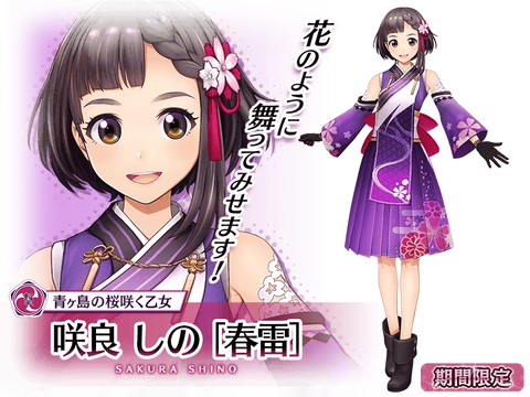 Born in Aogashima of the Izu Islands, Shino is an innocent yet naive girl raised by former Imperial Troupe star Kirin Aoshima while being the biological daughter of Kirin's coequal, Nadeshiko Sakura. She spent most of her life watching recorded stageplays of her mothers' primetime with her childhood friends, Fuuka Aoshima and Asebi Mikohama. Shino dreams' begin to unravel as a young stranger crash-lands on the island.